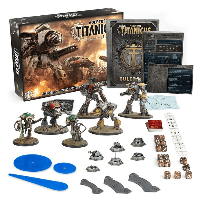 Adeptus Titanicus es un juego de mesa de devastadores combates entre impresionantes dioses-máquinas, ambientado durante la guerra civil que desgarró la galaxia. Dos jugadores toman el control de una variedad de titanes: colosales máquinas de guerra bípedas cubiertas con una armadura gruesa y armas que pueden arrasar una ciudad con una sola andanada. Es un desafío estratégico en el que enfrentas tu habilidad y astucia contra tu oponente en una batalla a muerte; una prueba de habilidad táctica que exige la gestión de los recursos a tu disposición, determinando las reacciones óptimas al estado evolutivo del campo de batalla.